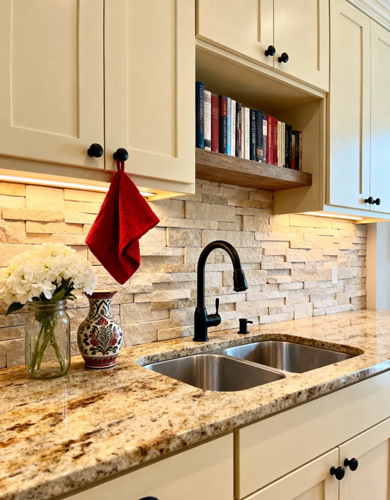 The sunny warmth of this kitchen is just infectious! The backsplash uses a light, beige stacked ledge stone, which instantly brightens the area and complements the speckled granite countertop beautifully. The simple wooden shelf nestled between the cabinets adds a nice spot for decor or, in this case, a mini library! The contrast of the black faucet and cabinet knobs against the creamy cabinets is subtle but sharp.