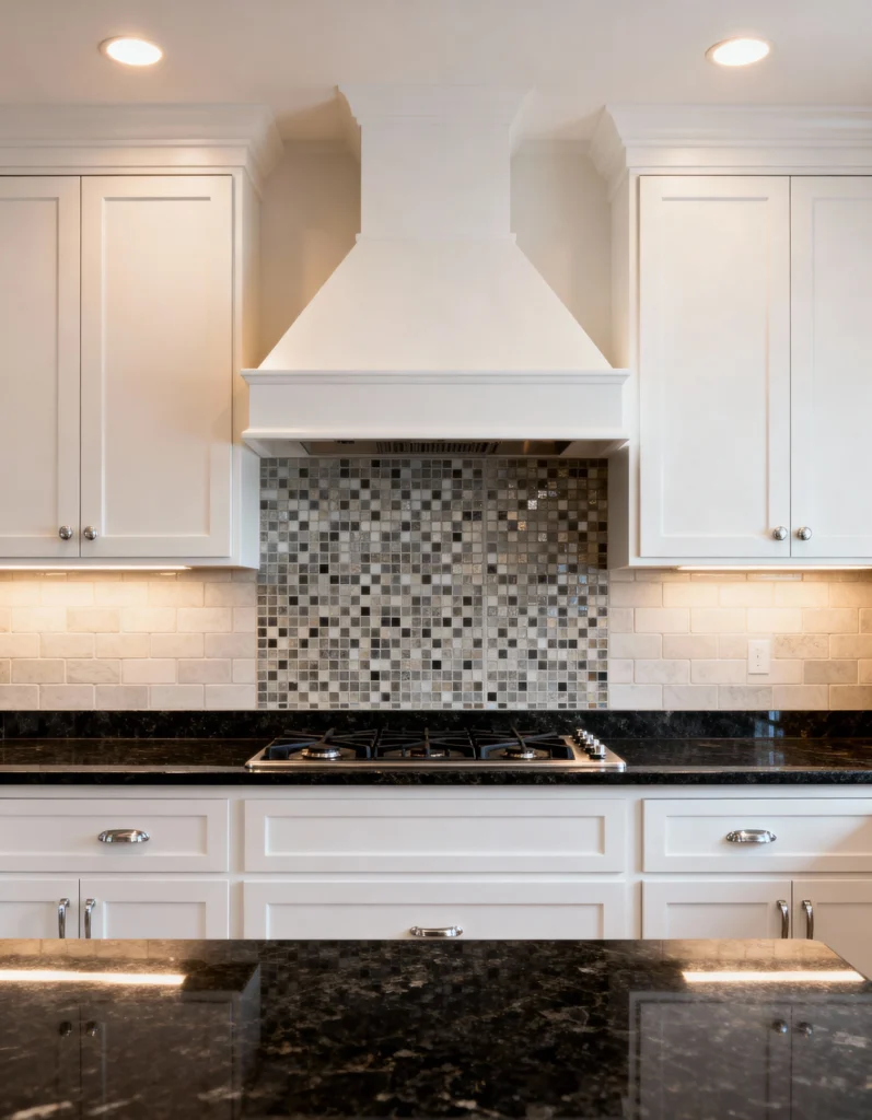 This kitchen goes for a more traditional look with a beautiful custom range hood structure. The backsplash uses a mix of light subway tiles and a fantastic mosaic feature above the cooktop, blending shades of white, gray, and black. It adds a touch of glam without feeling over the top. The dark, speckled granite countertop grounds the space, creating a lovely frame for the stainless steel cooktop.
