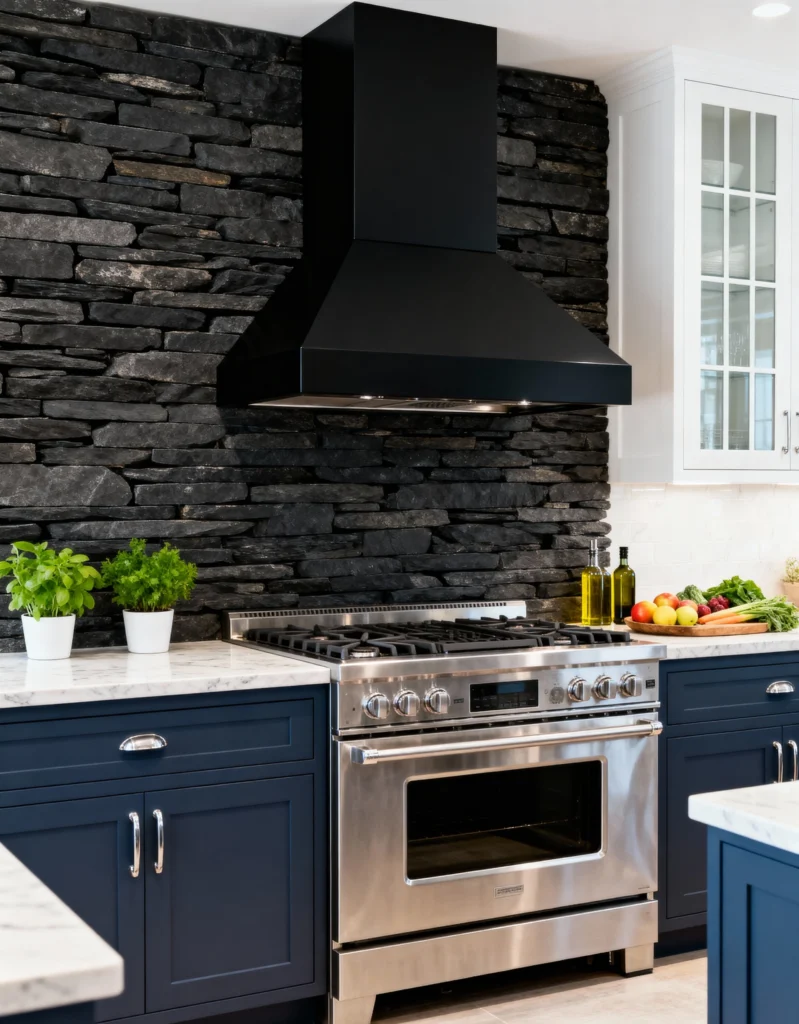 If you’re looking for drama, this is it! The contrast here is stunning. The black, stacked-stone backsplash provides an intensely dark, textured backdrop for the sleek, modern black range hood and stainless steel appliance. Paired with the deep navy blue lower cabinets and the crisp white upper cabinet, the stone wall adds a sophisticated, contemporary rustic edge. It’s a perfect example of how dark colors can make a space feel rich and luxurious, not just heavy.