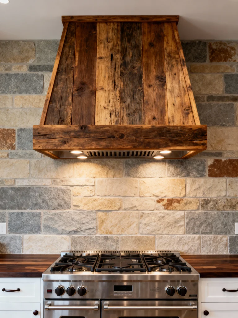 This kitchen perfectly balances rustic wood with natural stone. The striking range hood, crafted from beautifully aged, reclaimed wood, draws the eye right up and complements the varied, earthy tones of the stone wall behind the stainless steel range. The stones themselves have a mix of gray, beige, and tan, giving the space a wonderful depth and texture. It’s a bold look that feels grounded and incredibly warm.