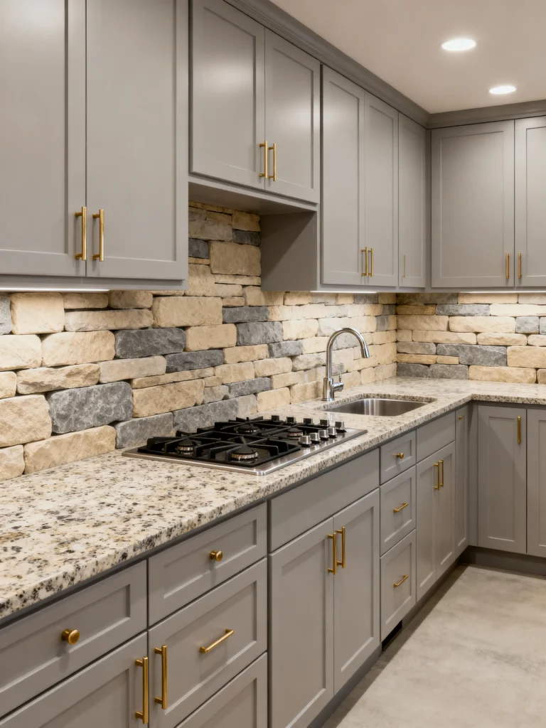 Here’s a fantastic example of mixing modern cabinetry with a rustic element! The clean, light gray cabinets with the striking gold hardware bring a contemporary, tailored feel to the space. The backsplash, made of varied-tone stacked stone in grays and beiges, adds the perfect grounding, organic texture. The light granite countertop with dark flecks ties the two main elements—the stone and the cabinets—together perfectly. A great balance of old and new!