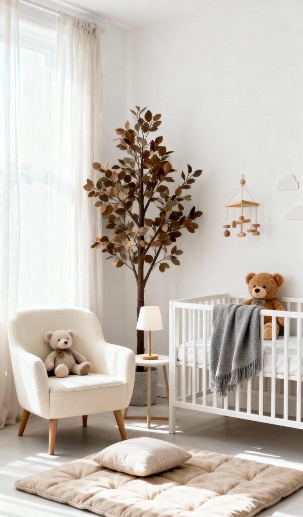 For those who love a clean, sophisticated look, this Minimalist Calm nursery hits all the right notes. It’s built on a foundation of warm whites and creams, creating a peaceful, clutter-free environment. The large, realistic faux tree adds a wonderful, organic texture and height to the room. A simple white crib, a cozy armchair, and a mobile with wooden elements complete this chic, tranquil space. It feels incredibly serene and grown-up, but still perfectly sweet for a baby.