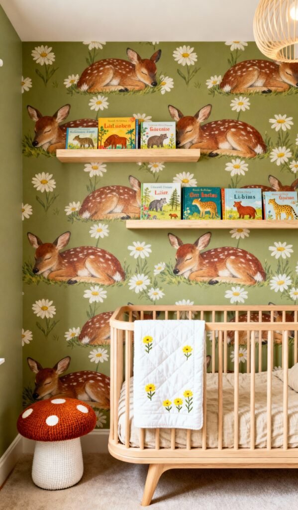 This Whimsical Meadow theme is just adorable. The green background with deer and daisies is such a playful, charming wallpaper choice. I love how the floating shelves are used to display colorful storybooks, turning them into part of the decor. The light wood crib looks modern and simple against the busy wall, and that knitted mushroom ottoman is the sweetest touch. It’s a happy, vibrant space for a little one to grow.