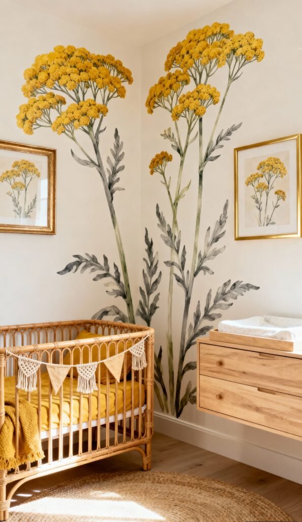 am absolutely obsessed with that wall mural! The giant, golden-yellow florals (they look like yarrow or a similar wildflower) instantly transform this corner into a bright, cheerful meadow. Using a stunning watercolor style, the mural is the star of the show, flowing right from the wall and wrapping the corner beautifully. They’ve kept everything else beautifully earthy, pairing the bold yellow with a chic rattan crib and a light wood changing table. The whole vibe is natural, cozy, and perfectly serene for a little one!