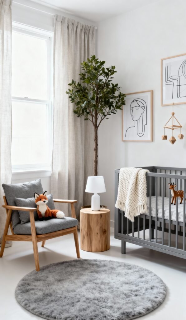 I’m obsessed with this Cozy Modern look! The palette of cool grey, natural wood, and crisp white is so calming and contemporary. The wood-framed rocking chair with a plush cushion looks super comfortable. And seriously, how cool is that tree stump side table? The fluffy grey rug softens the space, while the simple line art on the wall and the wooden mobile keep the aesthetic clean and chic. It’s proof that a neutral nursery can still be full of personality.