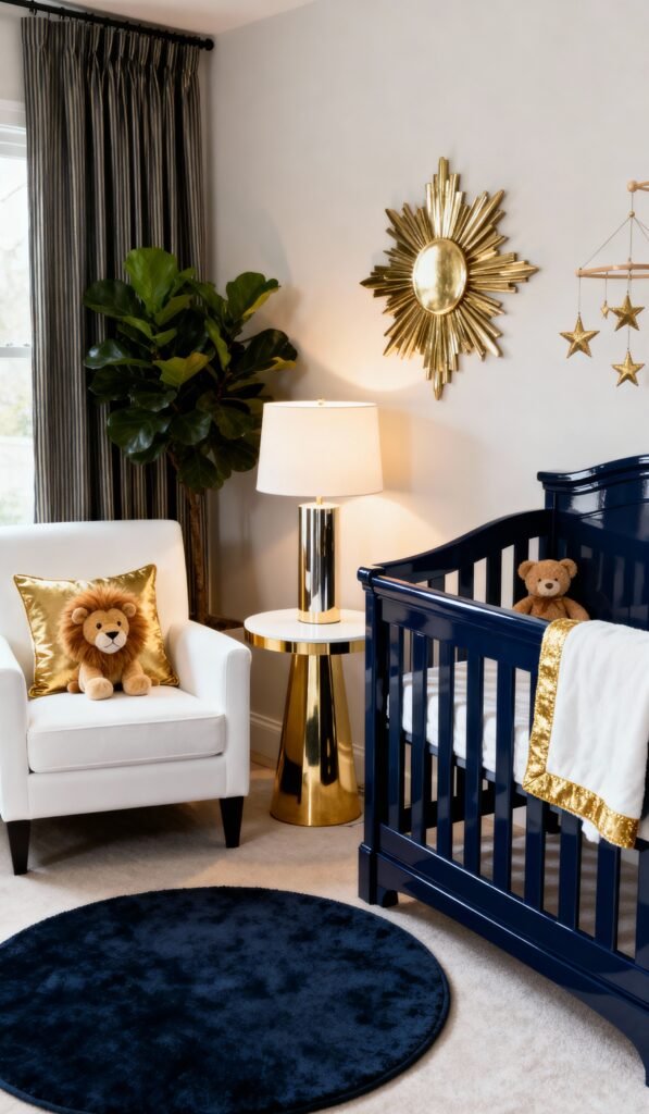This room is all about Regal Accents and dramatic flair! The rich, glossy navy blue crib is a stunning focal point, especially paired with that beautiful gold trim on the blanket. The metallic sunburst mirror and the gold-and-marble side table add a touch of glamour. It’s a sophisticated take on a nursery—the white armchair and simple rug balance the boldness of the navy and gold perfectly. Definitely a room fit for a little prince or princess!