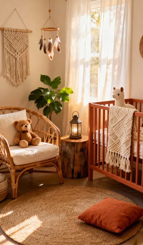 This nursery is giving me all the warm, earthy feelings! The Sunset Warmth comes from the terracotta-colored crib and the matching floor cushion. The rattan chair, woven rug, and macrame wall hanging double down on that lovely, natural boho texture. The rustic wooden tree stump and the lantern-style lamp add a cozy, almost enchanted cabin feel to the corner. It’s an incredibly inviting and beautifully layered space.
