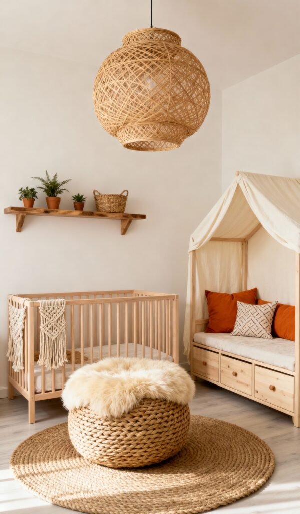 This nursery is pure, sun-drenched Boho Bliss! I absolutely adore the layered natural textures here. The chunky woven light fixture, the macrame on the crib, the jute rug, and that super cozy sheepskin ottoman create such a warm, inviting space. The wooden crib and daybed-style reading nook (with those perfect terracotta cushions!) keep the look grounded and serene. It proves you don’t need a lot of bright color to make a room feel happy—just lots of texture and sunshine!