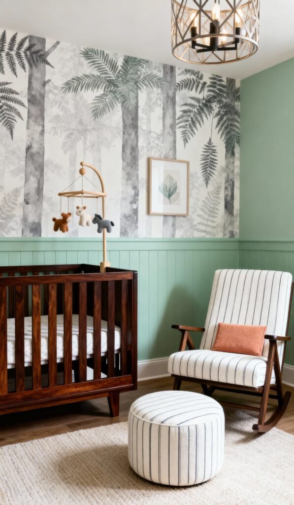 The watercolor-style wallpaper with tall trees is the star, bringing a lovely, soft nature element right inside. That rich, dark wood crib offers a beautiful contrast to the refreshing mint green paneled wainscoting. And let’s talk about the textures—the striped glider and ottoman look so comfortable for those late-night feedings! It’s the perfect mix of whimsical and modern.