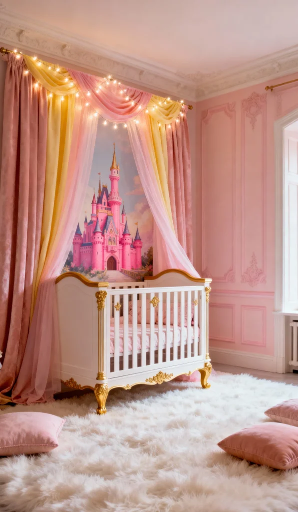 This pink-on-pink nursery is straight out of a Disney movie. The mural of the grand pink castle serves as the perfect backdrop to the gorgeous crib. The sheer pink and yellow curtains, draped and lit with fairy lights, make the crib feel like the most important, cozy spot in the world. And look at that plush, shaggy white rug! It’s all about creating a soft, warm, and utterly magical first room for a little one.