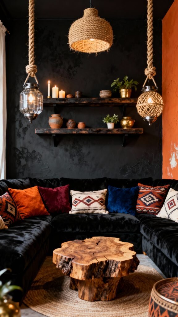 Similar to the Bohemian Black , but with a fantastic rust-colored accent wall! This photo really highlights how rich textures—like the chunky rope on the hanging lanterns and the jute rug—can bring warmth to a black room. The rustic wood shelves with small, curated objects and the cluster of candles add a wonderful, soft glow. It feels global, layered, and incredibly welcoming. That natural wood coffee table is truly a work of art!