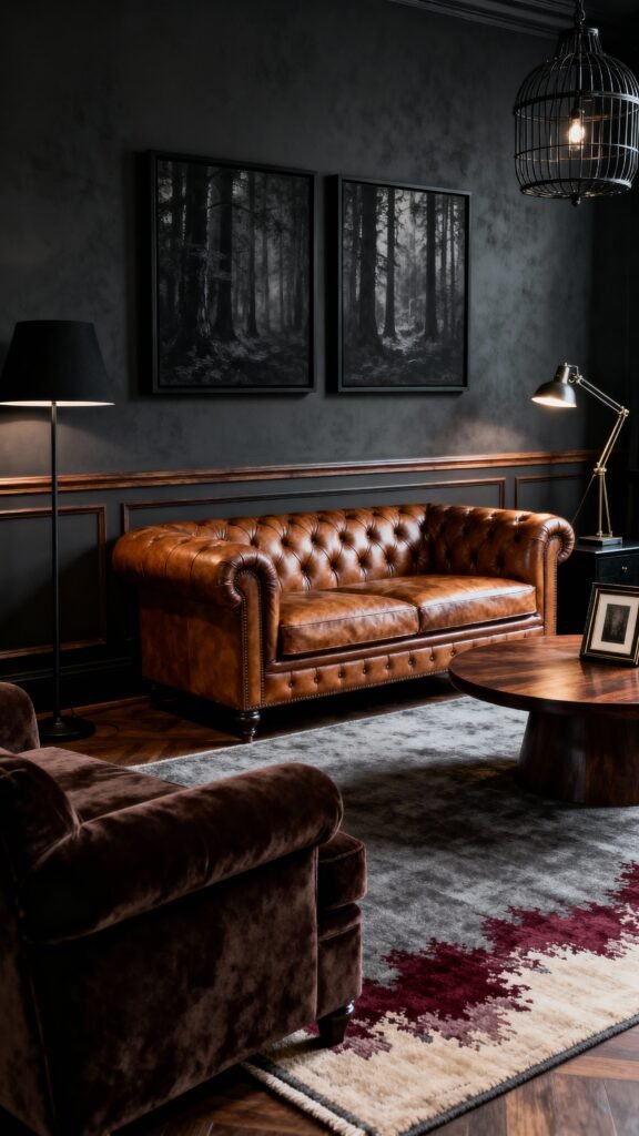 This space feels like a true retreat—a sophisticated man-cave vibe! The classic brown leather Chesterfield is the anchor piece, complemented by the rich brown velvet armchair. I love the addition of the forest prints, which echo the moodiness of the dark paneled walls. The area rug is a perfect transitional piece, bridging the dark walls and the warm leather with its gray and deep cranberry hues. It’s inviting, dark, and perfectly tailored.