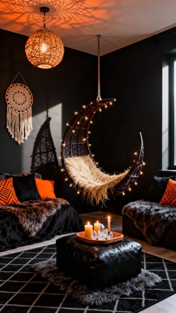 This is Halloween meets chic, and I am here for it! The black background makes the bright orange accents really pop—especially those throw pillows. But the real star is that incredible crescent moon hanging chair wrapped in string lights! Paired with the macrame wall hanging and the furry throws, it creates such a fun, witchy, yet super-cozy atmosphere. It’s a playful and incredibly unique take on a dark living room.