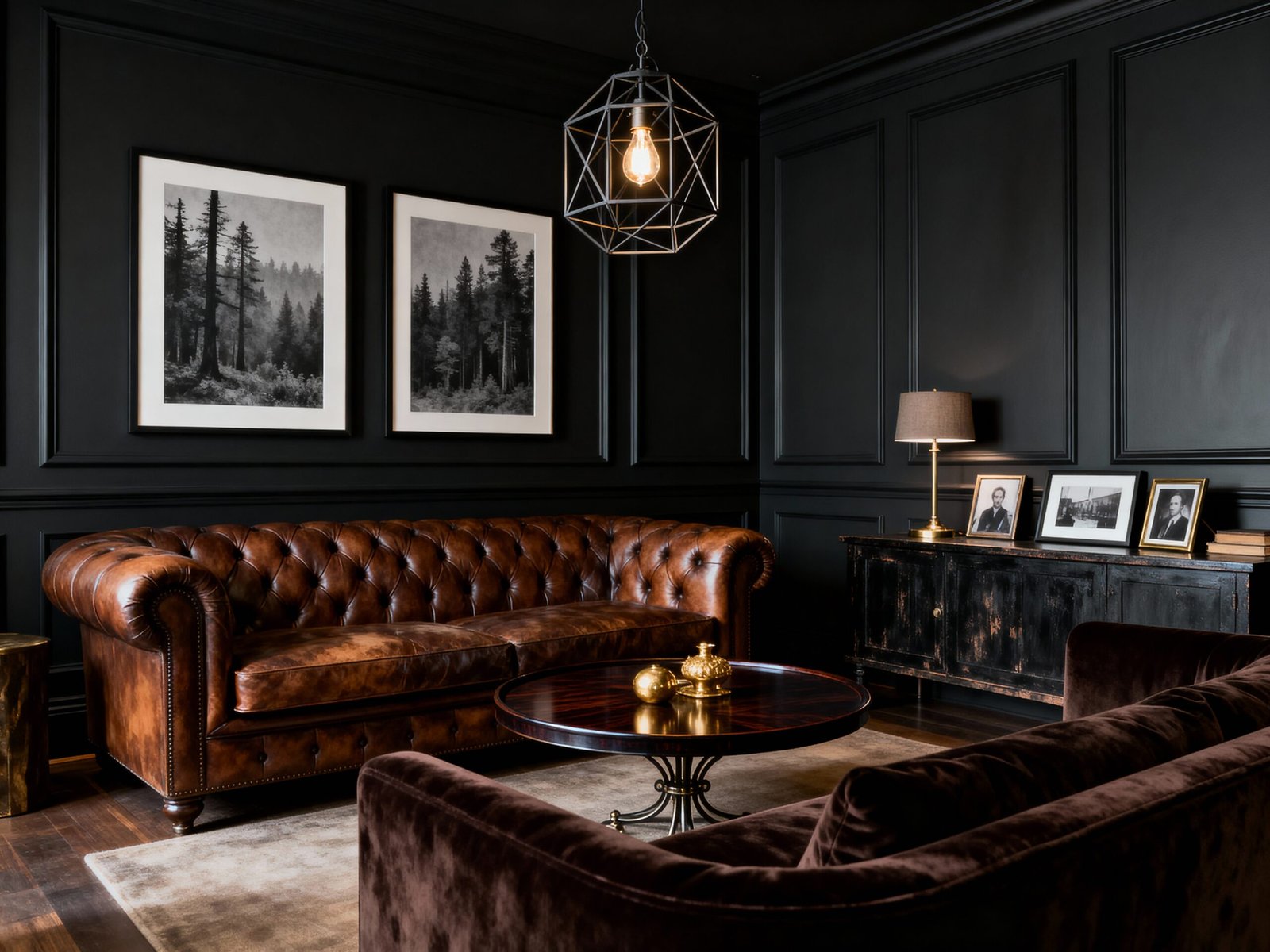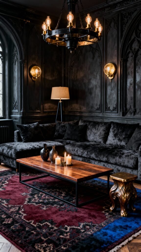 Talk about drama! This space has a seriously gothic-chic vibe, thanks to the ornate wall paneling and what looks like a deeply arched window. The crushed black velvet sofa looks plush enough to sink into forever. That antique-style chandelier with the exposed bulbs is fantastic, and the rug, with its rich burgundy and blue tones against the dark wood floor, adds a vibrant layer of color. It feels like a modernized European castle parlor—so moody and magnificent.