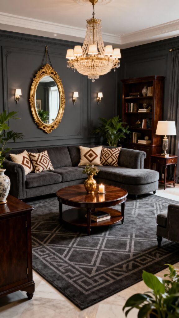 Okay, if the last room was gothic, this one is pure regal elegance. The walls are a deep, sophisticated charcoal gray, and the crystal chandelier is absolutely dazzling. That beautiful, dark wood bookshelf and side table give the room a classic, library feel. The patterned rug and geometrically patterned pillows offer a subtle contrast to the otherwise solid colors, making the whole space feel tailored and smart. I love how the large oval gold mirror bounces light around!