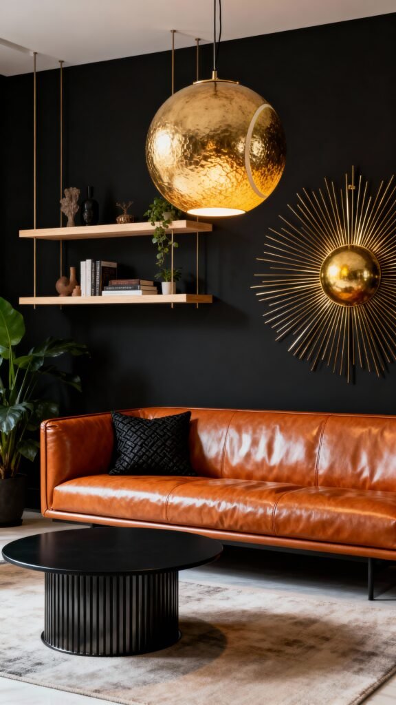This room is a fantastic example of a modern, dark space. The black walls and black round coffee table contrast beautifully with the sleek, bright cognac leather sofa. The metallic gold light fixture and the starburst wall art are stunning focal points that introduce warmth and a touch of glamour. The simple, light wood floating shelves are great for displaying a few key pieces without cluttering the drama. So polished and sophisticated!