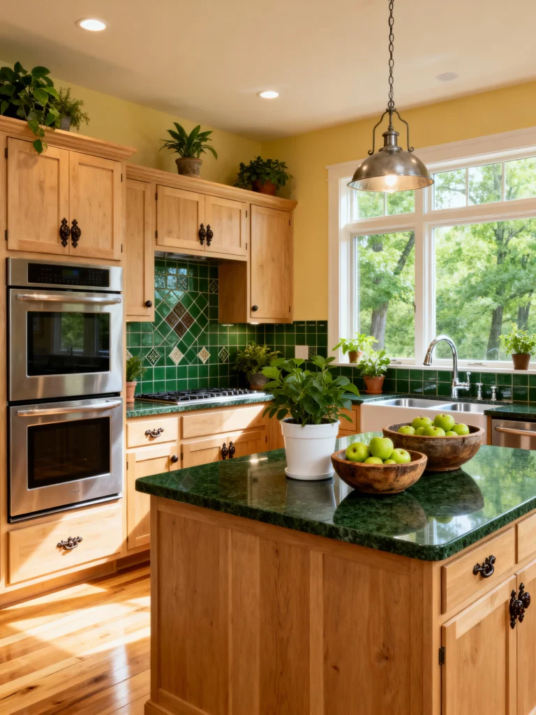 Okay, now this kitchen is a burst of personality! I adore how the homeowner embraced color. The natural, light wood cabinetry provides a sunny base, but the real star is that stunning, deep green granite countertop on the island. Seriously, it’s a showstopper! The matching green tile backsplash, with its diamond-patterned accents, ties the whole look together and provides a beautiful contrast to the warm wood and cheerful yellow walls. The double wall oven is super practical, and all the live plants scattered around make the whole space feel fresh and alive. This is proof that you can use bold colors in the kitchen without sacrificing warmth or style!