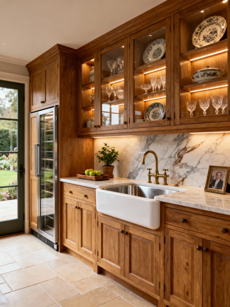 Talk about sophisticated storage! This kitchen corner is a masterclass in combining utility with display. The rich, medium-dark wood has a lovely, classic feel, but the backlit glass cabinets really elevate the look, turning simple dishware into art. The exposed white and gray marble backsplash adds an element of luxe texture that pairs beautifully with the brass-toned faucet and hardware. The farmhouse sink is a comforting classic, and integrating a full-size wine fridge right into the cabinetry is brilliant for anyone who loves to entertain. Plus, stepping out that charming green door right into a lovely garden? Pure perfection.
