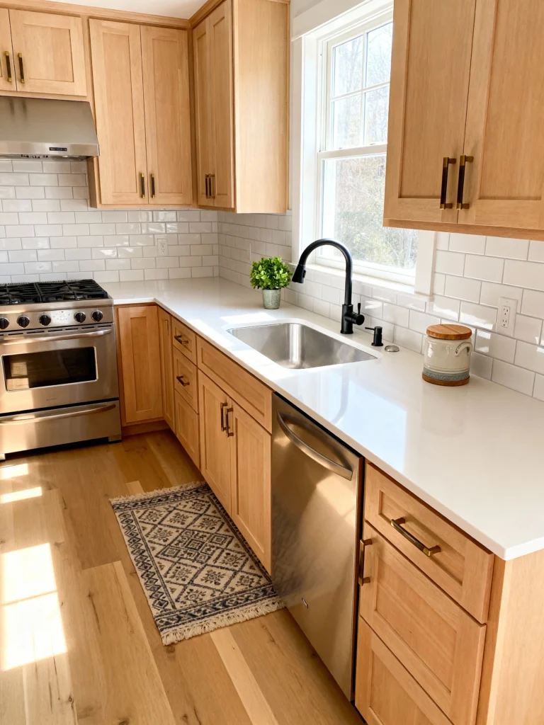 This kitchen is the epitome of classic, light, and airy design. The natural oak cabinets look fantastic paired with the ever-popular white subway tile backsplash—it’s a combination that truly never goes out of style! The centerpiece is that beautiful window overlooking the greenery, perfectly framed by the simple white trim and hanging pendant lights. The big white farmhouse sink is, of course, essential for that classic look. I also love the glass-front upper cabinets used to display neat stacks of white plates—it’s practical storage that also doubles as clean decor. This is a wonderfully balanced and timeless kitchen!
