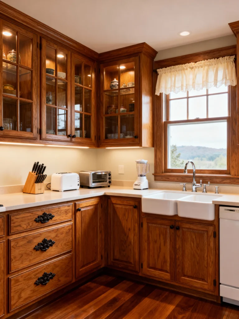 This kitchen is giving me cozy, traditional comfort! The rich, dark oak wood cabinets have a classic look, enhanced by the detailed glass fronts and the warm lighting inside. I love how the cabinets frame the window, turning it into a beautiful focal point. The choice of vintage-style black pull hardware on the drawers adds a lovely, slightly antique feel. A double farmhouse sink is perfect for busy cooks, and the light countertop and subway tile keep the space from feeling too dark. It’s a warm, inviting corner that feels perfect for making a cup of tea and watching the weather outside.