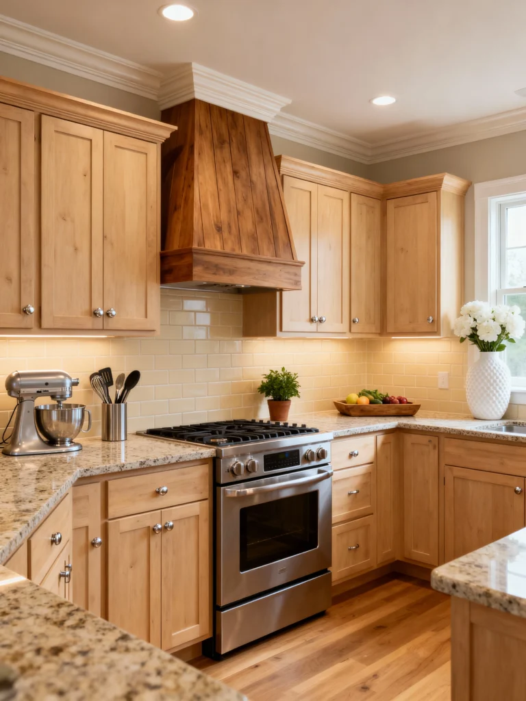What a bright and cheerful kitchen! The natural wood cabinets here have a lovely, light tone that makes the whole room feel sunny and open. The big, beautiful speckled granite countertop adds wonderful texture and a hint of warmth that complements the wood. But my favorite detail is the custom-designed, rustic wooden range hood—it’s a striking piece that gives the standard cabinetry a serious upgrade! The pale yellow/cream subway tile backsplash is a subtle choice that keeps the space feeling light, while the stainless steel appliances ensure everything stays functional and modern.