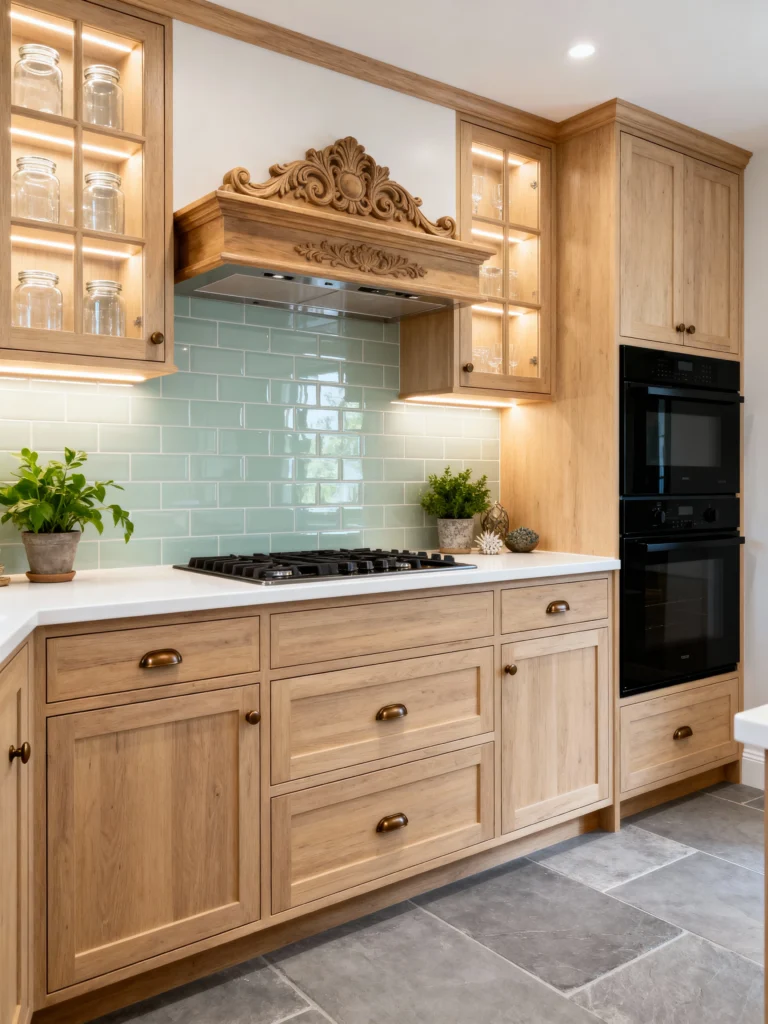 This kitchen is a unique mix of styles! The light wood cabinets and sleek white countertop feel contemporary, but the incredible carved wooden range hood brings in an element of artistic, traditional craft. The biggest statement, though, is the backsplash: a gorgeous, glossy, mint-green subway tile. It introduces a subtle but beautiful color that contrasts wonderfully with the warm wood and the dark, slate-like floor. Integrating the double wall ovens is a smart, space-saving design, and the dark, cup-style cabinet pulls add a perfect vintage touch.