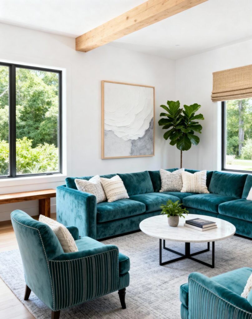 This space is all about light, texture, and serene color! The large teal sectional is paired with simple, natural accents like the exposed wood beam and the woven window shades . The soft, textured cream and white pillows add comfort and contrast against the velvet. The light gray, subtly patterned rug and marble coffee table ensure the room feels airy and modern. The overall effect is sophisticated but relaxed—a perfect balance of chic velvet and calming coastal elements.