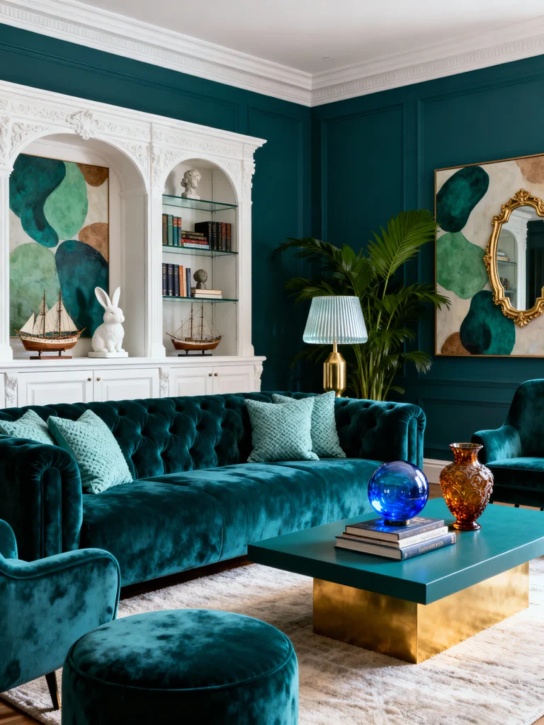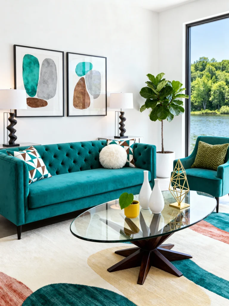 Sleek, bright, and incredibly stylish! This room proves teal can absolutely work in a contemporary setting . The streamlined, button-tufted sofa and matching chair in that rich teal velvet are stunning. The large, abstract artwork uses similar colors, pulling the whole look together. I especially love the mid-century inspired glass coffee table and the bold, graphic shapes in the area rug. It feels polished, balanced, and perfectly coordinated without being stuffy.