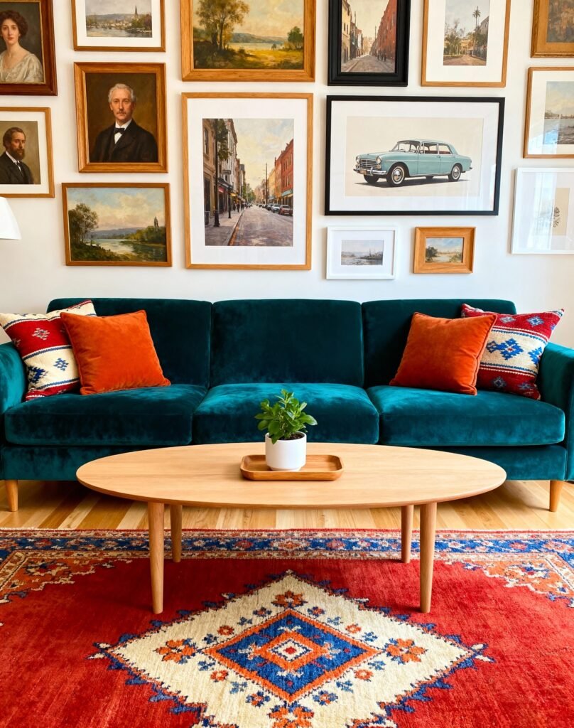 This room is a masterclass in combining rich colors! That deep teal velvet sofa is the undeniable star, and pairing it with the fiery orange pillows and the magnificent, patterned red rug is pure genius. The wood tones in the coffee table and the gallery wall of framed art keep the look grounded and classic. It has a beautiful, maximalist feel—it’s bold, cozy, and makes a serious statement without feeling overwhelming. It definitely screams “sophisticated eclectic.”