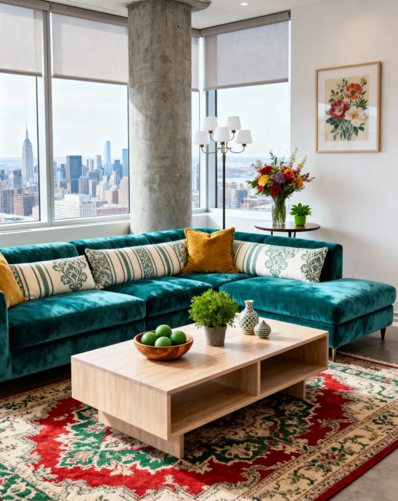 If you have a view like that, you need a sofa to match! This large teal velvet sectional looks incredibly comfortable and chic in this high-rise apartment . The subtle striped and floral patterns on the throw pillows, combined with the traditional red, green, and cream rug, introduce a traditional counterpoint to the contemporary architecture. The light wood coffee table and the simple, modern floral art piece keep the sophisticated feel light and airy, letting that fabulous skyline and the couch steal the show.