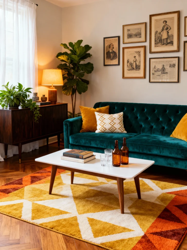 This space has a fantastic mid-century modern feel that is warm and incredibly inviting . The teal tufted sofa is balanced beautifully by the rich, dark wood of the credenza and the coffee table legs. But the real game-changer is the geometric rug in shades of mustard, saffron, and orange—it just injects so much vibrant energy and warmth! It’s a great example of how mixing jewel tones (teal) with earth tones (mustard/orange) creates a dynamic and sophisticated environment.