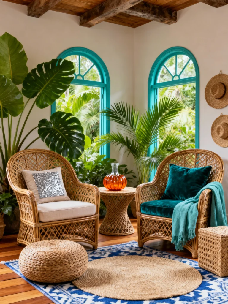 This is a breath of fresh air! The natural rattan furniture and the light, woven accents give this corner a fantastic, breezy tropical feel . The vibrant teal window frames draw your eye straight to the lush greenery outside, blurring the line between indoors and out. The small touch of teal velvet on the chair cushion and the throw is enough to integrate the color into the overall scheme, which is dominated by natural textures and the bright blue and white patterned rug. It’s the perfect spot for sipping a cool drink.