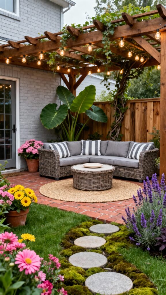 This is giving me major Mediterranean garden vibes! I love how the woven sectional and round jute rug create a super cozy, defined living area right on the brick patio. The string lights draped over the pergola add such a warm, inviting glow, especially as the sun goes down. And can we talk about the plantings? That huge elephant ear plant and the pops of pink and yellow flowers make the whole space feel lush and alive. It’s the perfect spot for sipping a cold drink.