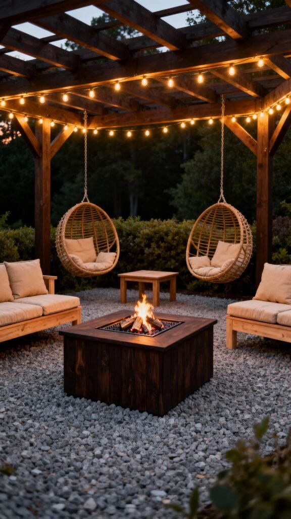 This is a super chic and modern take on the fire pit area! Instead of a simple bowl, there’s a sleek, dark wood fire table centerpiece, making it a true gathering point. The wooden-framed outdoor sofas and the pair of hanging wicker egg chairs provide ample seating with a stylish twist. The ground is covered in crushed gravel, which is a great, low-maintenance option for a dedicated patio space.