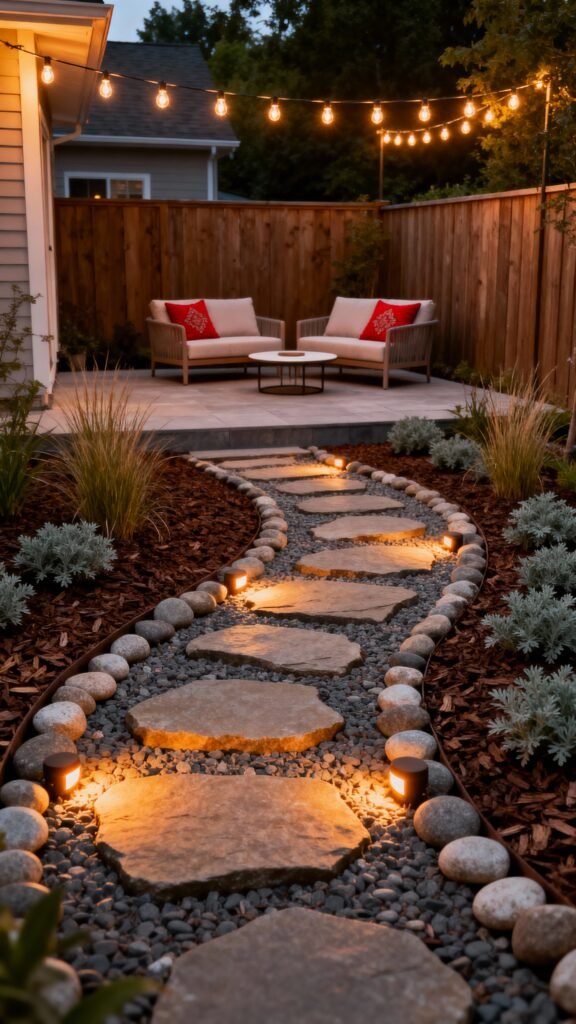 Doesn’t this path look magical? Stepping stones edged by river rocks and low-profile path lighting really guide you through the garden beautifully. The combination of mulch, dark pebbles, and silvery-green plantings creates fantastic texture along the way. At the end, there’s a little paved nook with two comfy chairs—the perfect intimate area for a late-night chat. The string lights overhead just seal the deal on this peaceful, evening atmosphere.