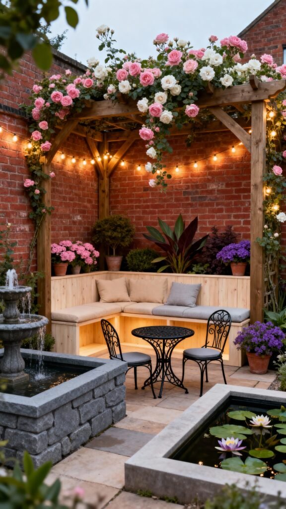 Oh my goodness, this is pure romance! The climbing pink and white roses over the pergola and along the red brick wall are simply breathtaking. Seriously, who needs wallpaper when you have that? I adore the combination of the custom light-wood built-in bench seating and the classic bistro set for dinner or coffee. The small fountain and lily pad pond add that wonderful sound of trickling water for a truly tranquil experience.