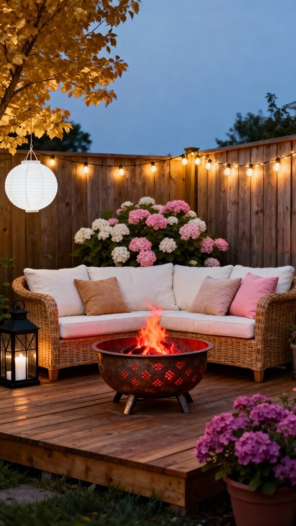 This is the ultimate hang-out spot for a chilly evening! The light wicker sofa with soft white cushions looks incredibly inviting, and the fire bowl is an instant centerpiece for gathering. Notice how the string lights and the single paper lantern add layers of warm lighting—it feels so intimate! The large pink and white hydrangeas nestled against the wooden fence add a lovely, soft backdrop to this relaxing retreat.