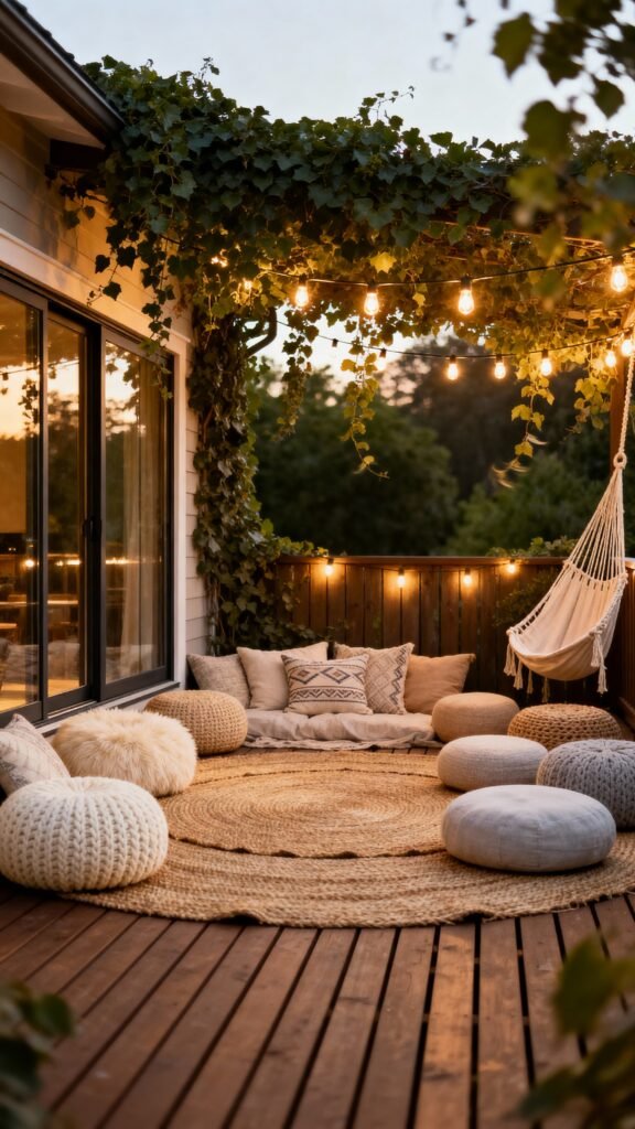 If maximum comfort is your goal, take notes! This is a dreamy, bohemian setup. The huge woven jute rug grounds the space, and the mountain of soft pillows and floor poufs makes it feel like an outdoor cloud. The hanging macrame chair adds a playful, relaxed touch. Even the way the string lights are draped and the ivy is climbing up the wall gives it a wonderfully enclosed and cozy vibe.