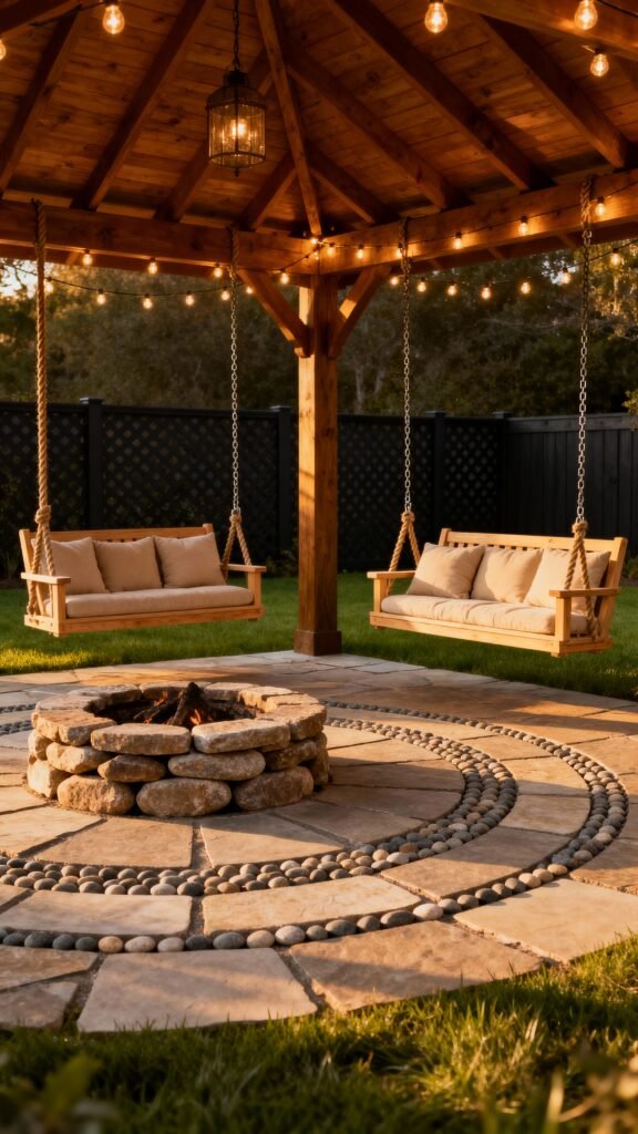 This space is built for long conversations and relaxing! The wooden swing beds under the gazebo roof are a brilliant idea—way better than standard chairs. The fire pit is surrounded by a beautiful stone circle, which is echoed by the concentric ring of darker pebbles and square pavers. It’s an incredibly organized and stylish way to blend hardscaping and fire features into the lawn area. So elegant!
