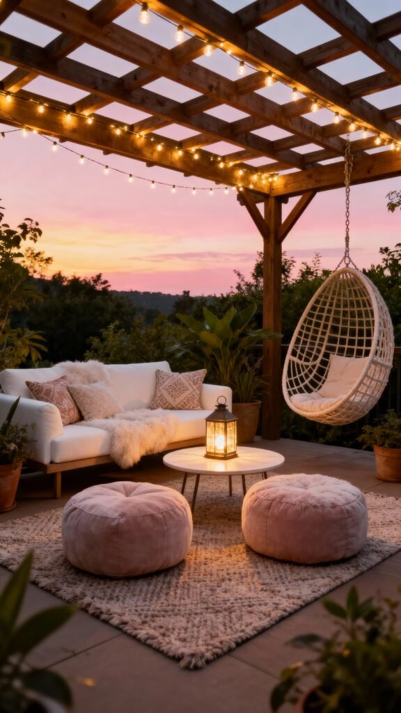 Okay, the sky in this photo is just breathtaking! This setup takes advantage of a stunning view. The modern white sofa contrasts beautifully with the soft pink poufs and fluffy textures of the cushions. The white wicker egg chair is the perfect companion piece, creating a fantastic little corner for reading. Everything feels light, airy, and super stylish against that incredible evening light.