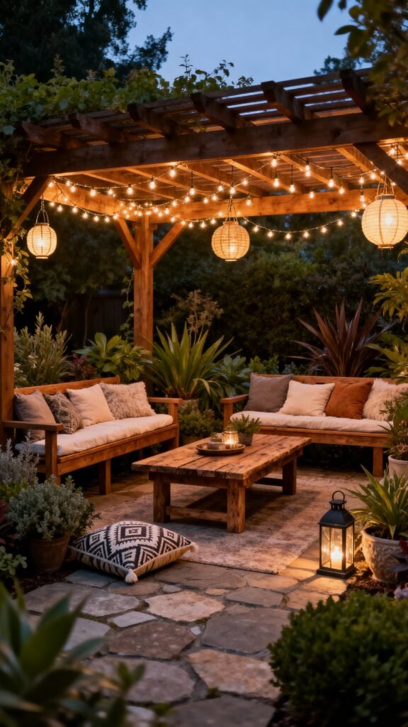 This patio is giving off a warm, jungle-luxe feel. The chunky wooden furniture and the rustic coffee table look fantastic under the wood pergola, which is heavily draped with string lights and vines. I love the addition of the three paper lanterns for soft overhead light and the variety of terracotta-potted plants. The patterned pillows and rug pull the whole earthy, cozy vibe together.