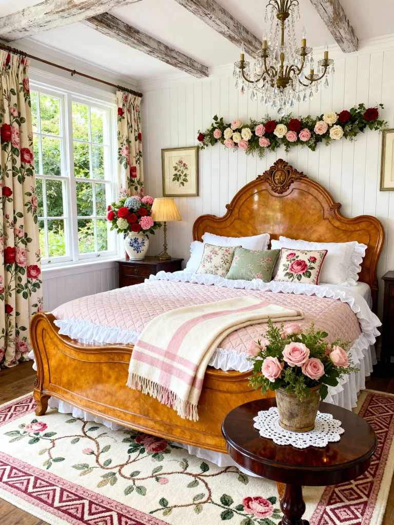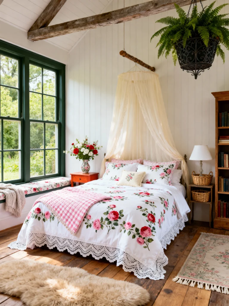 Seriously, I’m swooning over this! The distressed, hand-painted bed and armoire are exquisite—they look like treasured antiques. But the real joy here is the pattern play: those bold rose curtains paired with the lace-trimmed sheer panel are gorgeous, and the rug perfectly echoes the floral theme. Everything is tied together by the light, bright white walls and ceiling beams, making the pinks and greens really pop. It’s vintage charm, elevated!