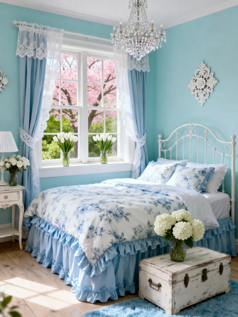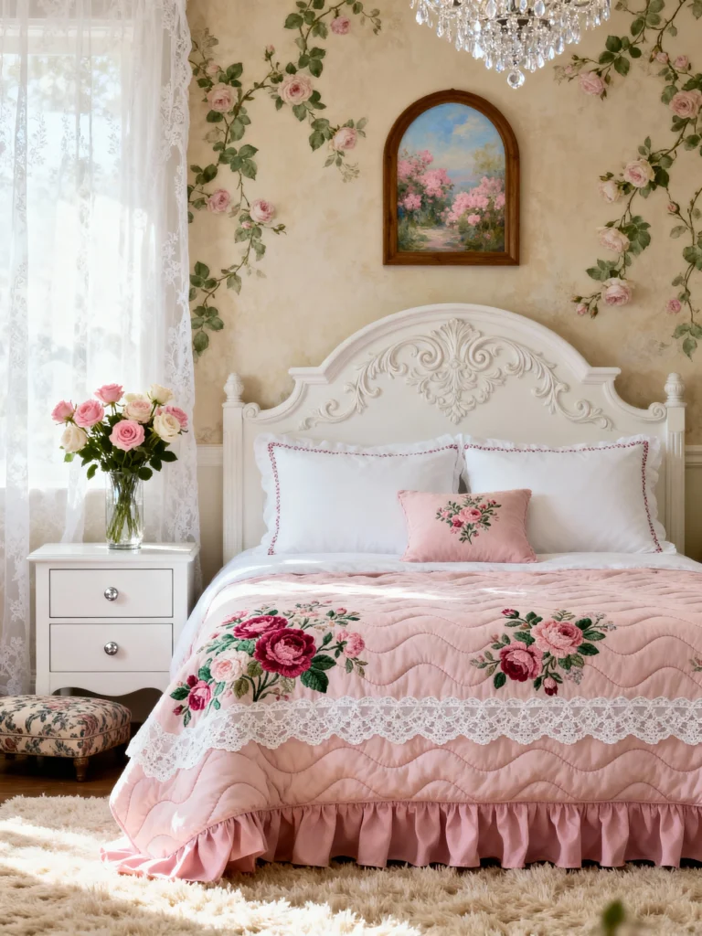 This is pure, luxurious romance! Everything about this room screams elegant cottagecore. The gorgeous white carved headboard is a showstopper, and the walls with the painted rose vines are just divine—it feels like sleeping in a secret garden! The bedding, a beautiful, lacy pink quilt embroidered with deep roses, is so plush. Paired with that dainty bedside table and the sparkling chandelier, this room is the ultimate feminine, dreamy retreat.