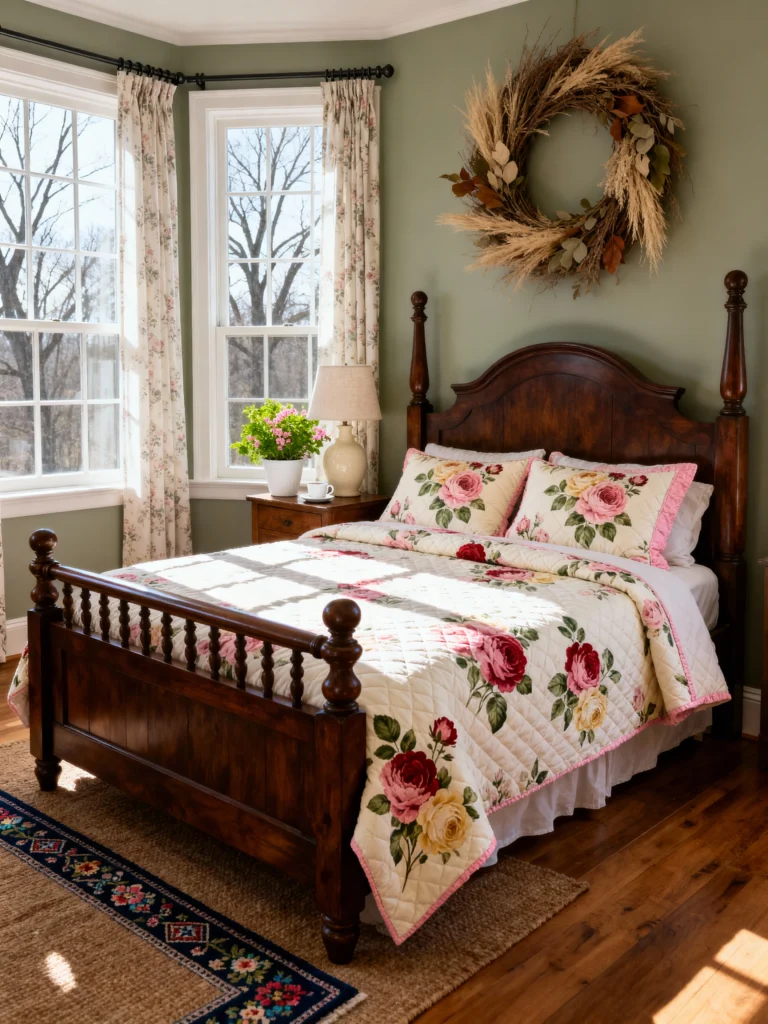 Talk about cozy! The deep, warm tone of the four-poster bed is the star here, giving the room a more traditional, grounded feel. The walls are painted in a lovely muted sage green, which is the perfect backdrop for the rich floral quilt. That huge, wispy wreath over the headboard is such a unique touch for a nature-inspired look—so chic for the autumn and winter months! The gentle light spilling over the bed makes this space feel incredibly welcoming and perfect for a lazy Sunday morning.
