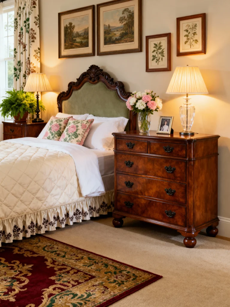 This bedroom is all about refined elegance. The rich, dark mahogany furniture—especially that beautiful chest of drawers—gives the room a sophisticated, tailored feel. The quilted cream duvet and the olive green upholstered headboard provide a soft backdrop for the floral pillows. The framed botanical and landscape art above the bed elevates the cottage feel, making it feel very polished and adult. The rug with the deep red accents adds a layer of depth and warmth!