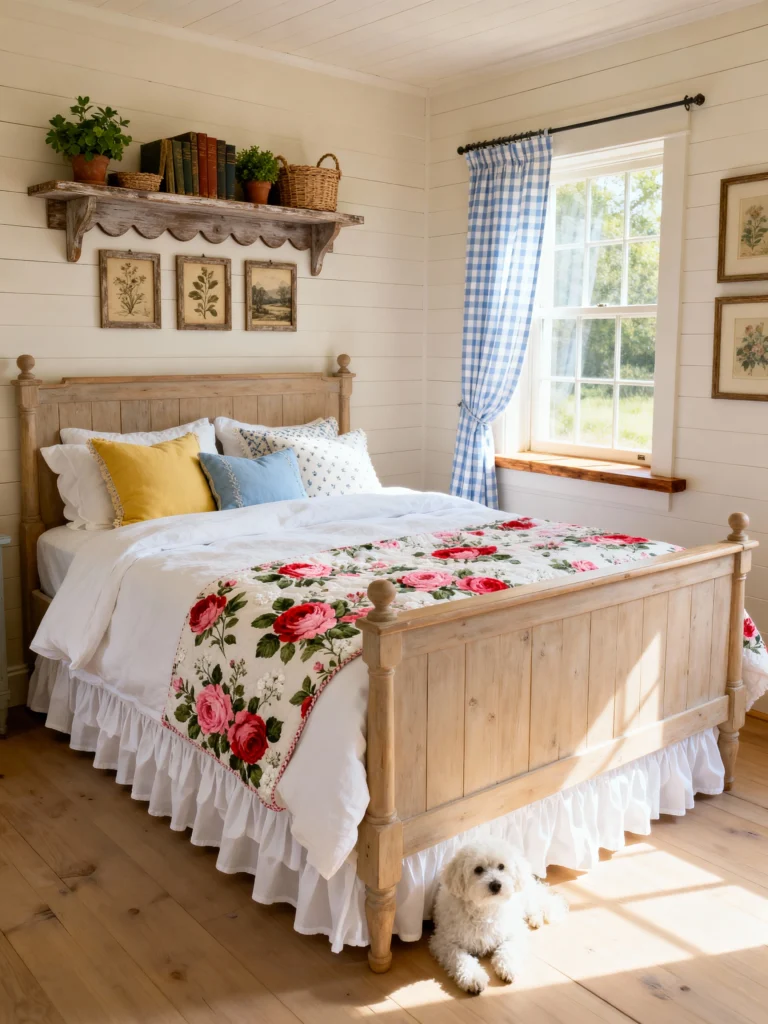 Hello, sunshine! This room is so bright and cheerful. The distressed natural wood bed frame and wide-plank floors give it a wonderful farmhouse feel. That little rustic shelf above the bed, styled with potted plants and vintage books, is simple perfection. But seriously, the blue gingham curtains? They add such a sweet, classic country punch! I love the mix-and-match pillows and the cheerful quilt thrown across the end. It’s just a light, happy space.