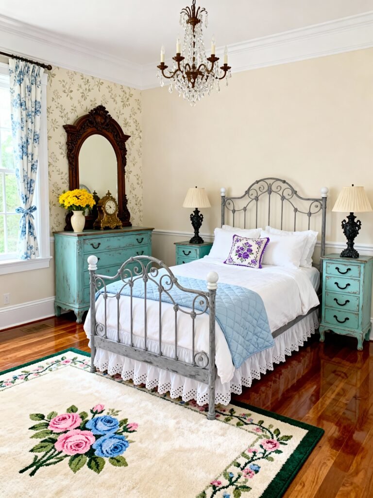 How much do we love this color palette?! The centerpiece is that fantastic shabby-chic blue dresser, beautifully distressed and paired with an ornate wood mirror. The iron bed frame is light and airy, perfectly balanced by the floral rug and the crystal chandelier. The little pops of aqua and cornflower blue in the furniture and the throw blanket make the whole room feel fresh and slightly vintage. It’s a wonderful example of mixing different eras and textures for a layered, inviting look.