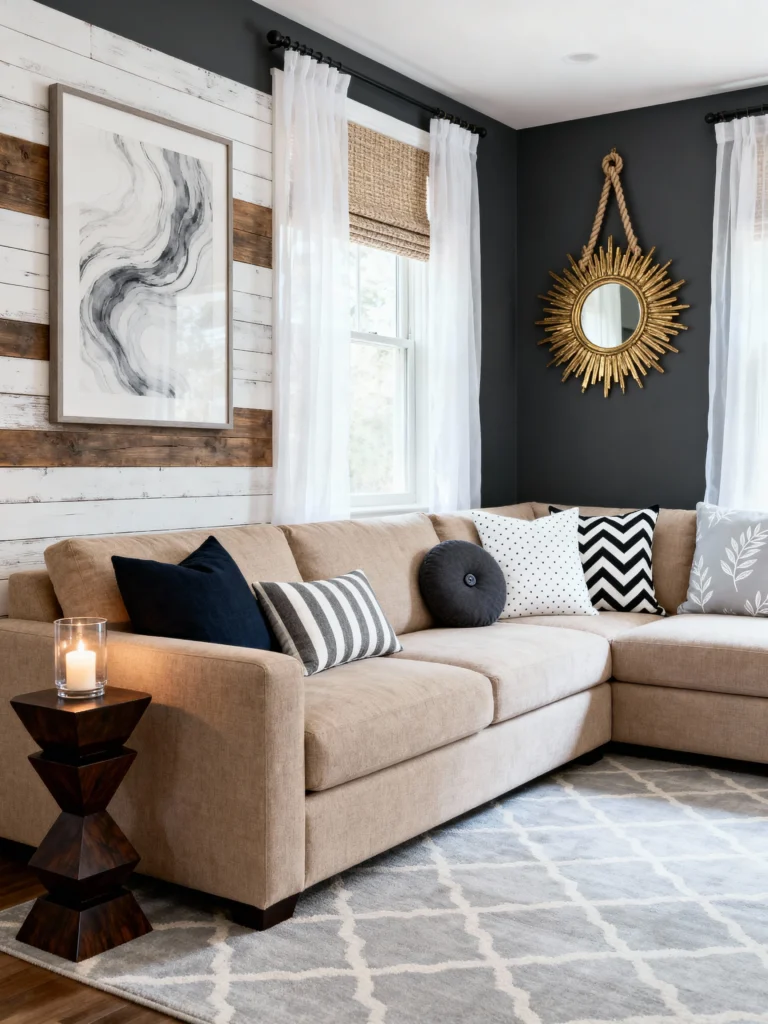 This room is a fantastic example of mixing rustic charm with modern edge! The dark charcoal walls provide a striking contrast to the shiplap accent wall, half of which is natural wood. The tan sectional is anchored by a cool gray-and-white patterned rug. I love the eclectic mix of cushions and the unique, carved wood side table. And that sunburst mirror? It’s the perfect touch of gold glam on the dark wall!