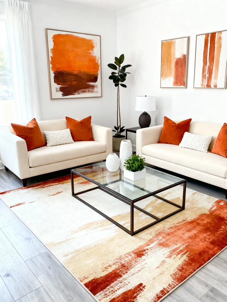 Talk about making a statement with art! The large, abstract paintings in shades of orange and terracotta really dominate this clean, white space. The twin cream sofas, kept simple with matching pillows, balance the bold wall. I like how the rug mimics the brushstrokes of the art, pulling the color story right onto the floor. The sleek glass and metal coffee table keeps the center of the room feeling light and modern.