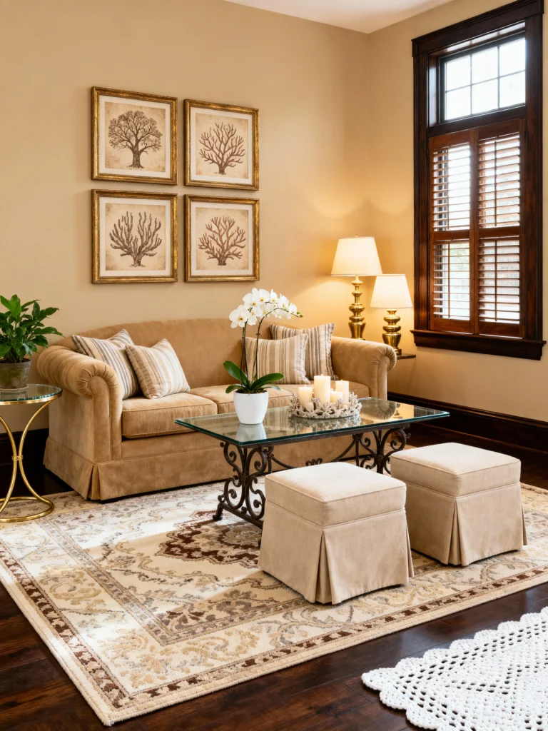 Now this is a room that just hugs you! If you love warmth and texture, this one’s for you. The rich, dark wood trim and window shutters give it a classic, established feel, contrasting beautifully with the warm tan walls and plush sofa. I absolutely adore the way the four framed botanical and coral prints are grouped—it’s such a simple, elegant gallery wall idea. The glass and wrought-iron coffee table and the sweet skirted ottomans keep the look soft and inviting. It’s the perfect setting for curling up with a book and a cup of tea on a chilly evening. So cozy and full of character!